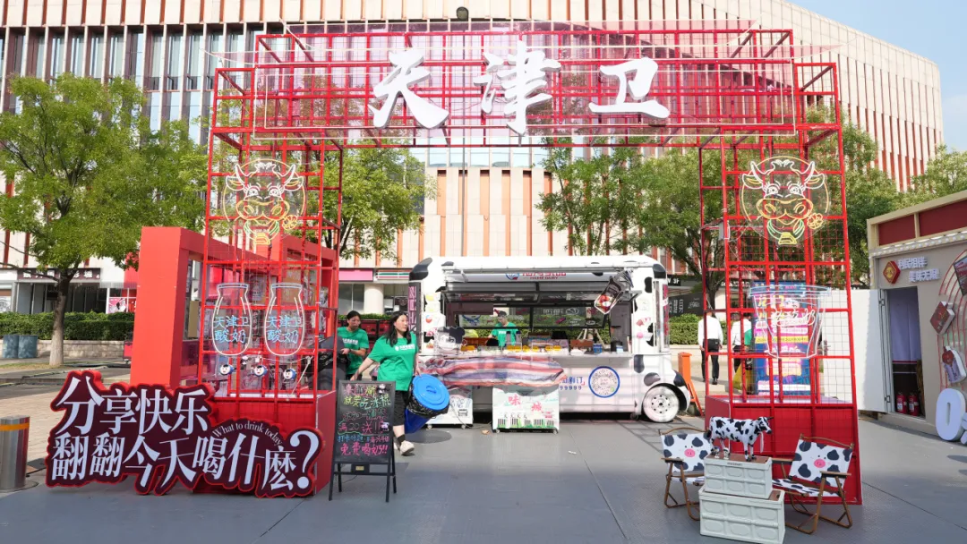 在展位設(shè)計(jì)上,結(jié)合天津地方特色,將中國(guó)紅與海河花色奶的“多姿多彩”相融合,創(chuàng)設(shè)“天津衛(wèi)”門(mén)頭吸引打卡拍照;搭建翻翻墻,市民可根據(jù)不同話題翻看不同產(chǎn)品,充滿趣味互動(dòng)性。售賣(mài)牛奶的牛奶巴士動(dòng)感十足,將牛奶花紋與“哪吒IP”形象相融合,可愛(ài)又富有活力。