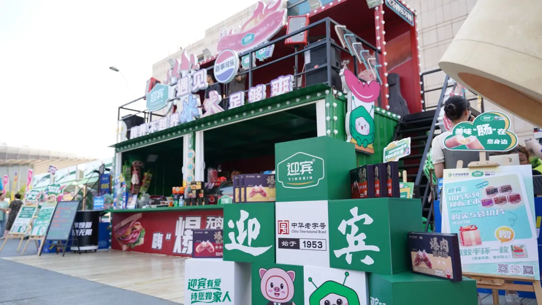 作為市集中的另一大亮點(diǎn),以紅綠撞色為主體思路,采用現(xiàn)代集裝箱風(fēng)格,頂部設(shè)置“烤腸”造型,與本次市集迎賓的主打新品“爆肉脆烤腸系列”前后呼應(yīng),4種口味滿足大眾味蕾。歌手每日演出精彩不停,讓消費(fèi)者在音樂(lè)中享受美食,游戲區(qū)和休閑區(qū)等多個(gè)打卡點(diǎn)吸引消費(fèi)者眼球。此外,迎賓與百事攜手聯(lián)名打造了跨界不越界的冰火效果,提高了迎賓的品牌知名度,迎賓與百事將以此為契機(jī),穩(wěn)步推進(jìn)深度合作。